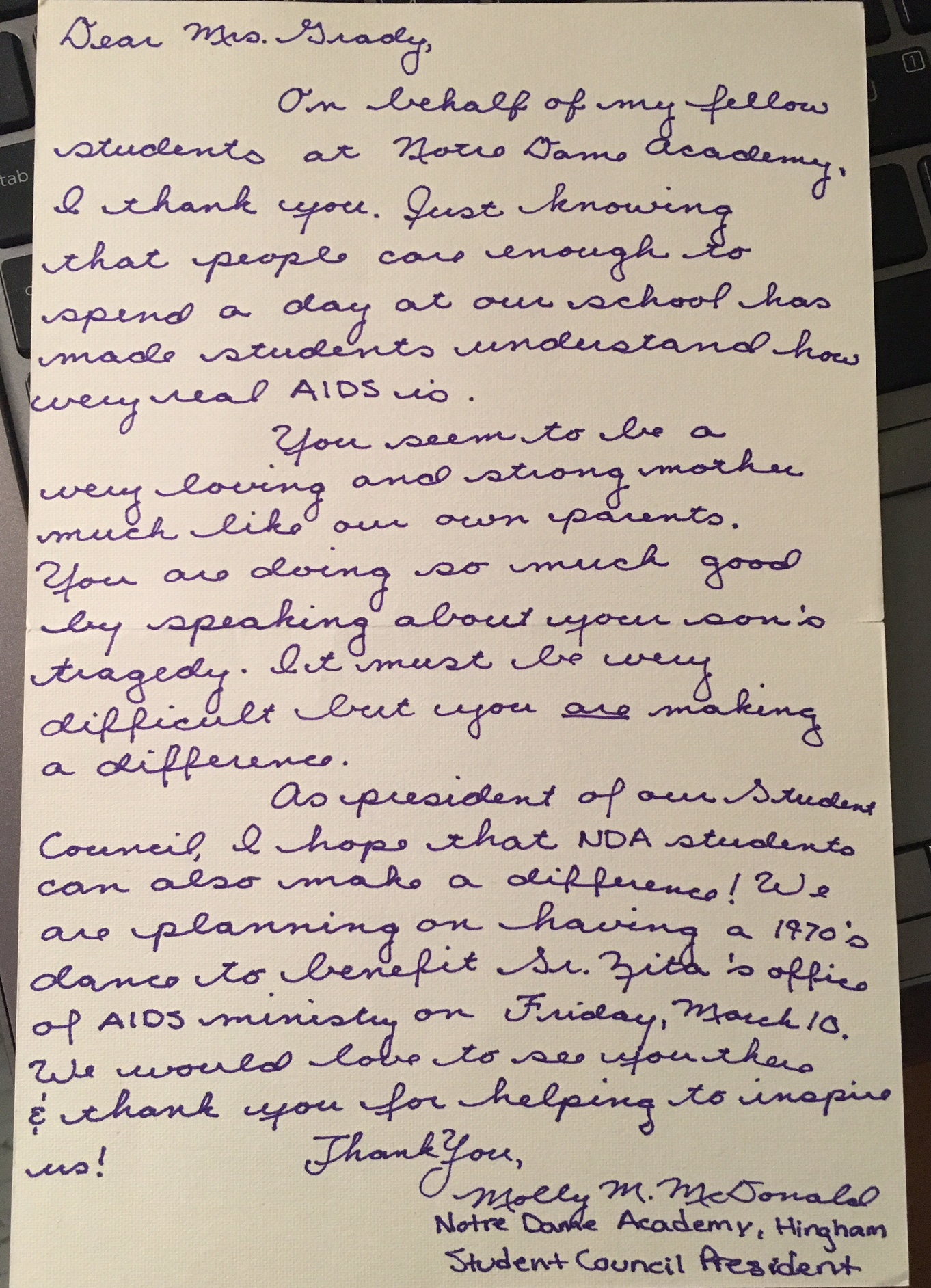 How my mom found the energy to do this for more than a year at dozens of speaking events is beyond me; it pains me just writing about this two and a half decades later. And in her well-attended talks with young people at Catholic churches throughout New England, my mom momentarily brought JB back to life — and doubtlessly saved a few lives in the process. Witness the “thank you” note (below) from a local school’s student council president, circa 1994: “Just knowing that people care enough to spend a day at our school has made students understand how very real AIDS is….you are doing so much good by speaking about your son’s tragedy. It must be very difficult but you are making a difference…”